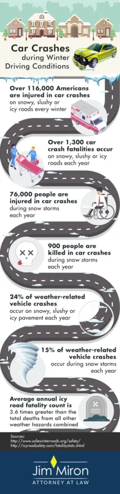 The following infographic highlights the large number of injuries and fatalities associated with car crashes during winter driving conditions. It’s crucial that you drive safely and defensively when the roads are snowy and icy to reduce your risk of these serious collisions.