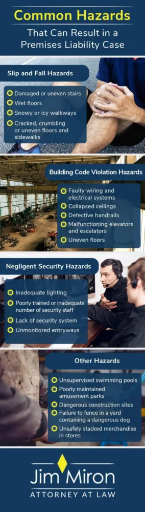 Premises liability law extends to just about any hazard that results in an injury on someone else’s property. Some other common hazards that may result in a premises liability lawsuit include: