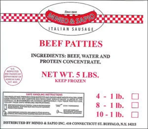 - 5-lb. boxes containing ten patties per pound of “MINEO & SAPIO BEEF PATTIES.”